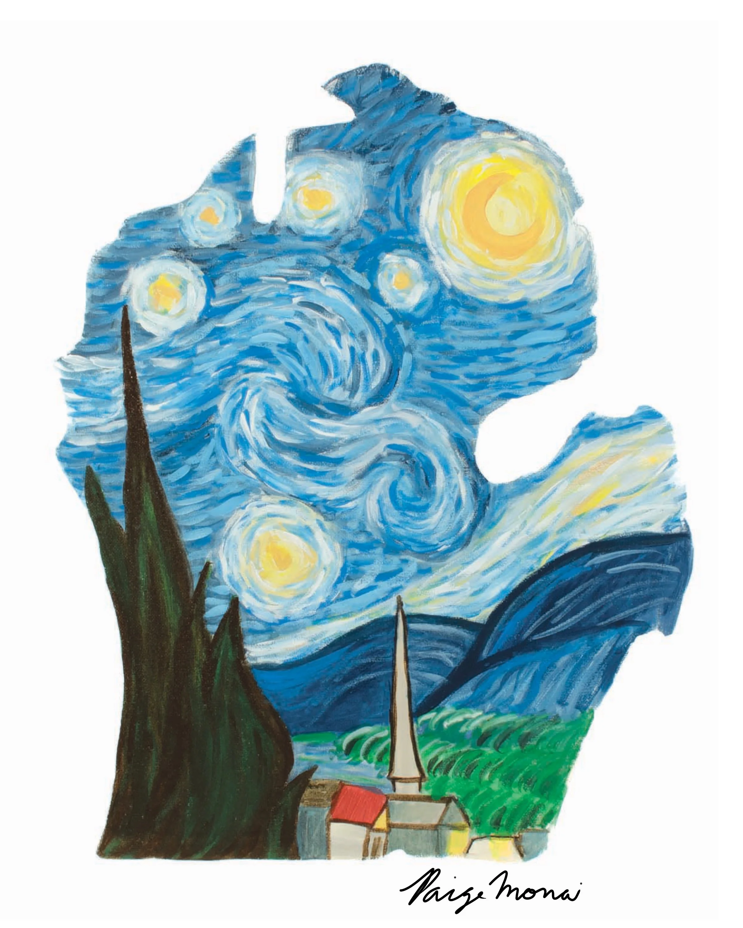 This painting started with a journey. I moved from one of the largest cities in the country to a small town in Michigan in 2025. When I arrived I was struck by the natural beauty and calm. Everyone that I’ve met here made me feel so welcome. The sense of belonging, peace, and home inspired me to create this painting. One of my Favorite paintings is Starry Night by Vincent Van Gogh. I always feel at peace when I see it and so it felt right to combine that feeling with how I feel about my new home.